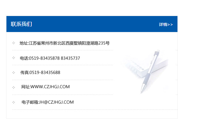 傳真:0519-83435688    郵編:213135    網址:WWW.czjhgj_com.ok-158.com    電子郵箱:JH@czjhgj_com.ok-158.com